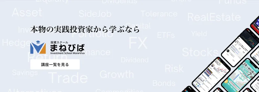当スクールの講座や情報の配信は投資知識の学習と向上を目的としており、投資助言業にかかる内容(個別銘柄の具体的な売買について)の情報提供はございません。また、入会された方の利益の向上を保証するものではありません。投資は自己責任となりますのでご了承ください。その他注意事項については、「まねびば」公式サイトの以下ページをご参照ください。