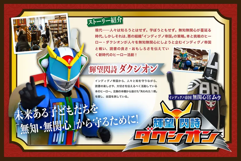画像に登場している当社オリジナルキャラクター「本と挑戦のヒーロー ダクシオン」