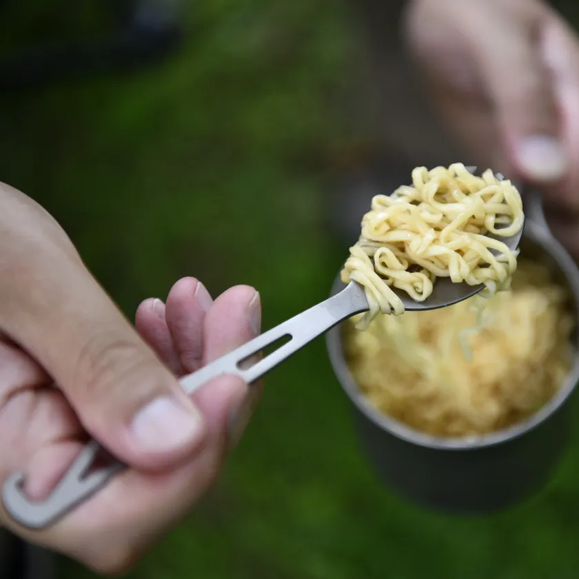 フォークとスプーンを兼用できる先割れスプーンがロングスプーンになりました。持ち手にはヒモを通せる穴が開いています。約21cmと菜箸程度の長さがあり、かき混ぜるなど調理の際にも便利なサイズ。先端はフォークとしてもスプーンとしても使えるのでスイカなどのフルーツや、カツカレーなど一品料理を食べる時にも活躍してくれます。荷物を減らしたい登山やツーリングでは、これ1本で何役もこなしてくれる頼もしい味方になります。