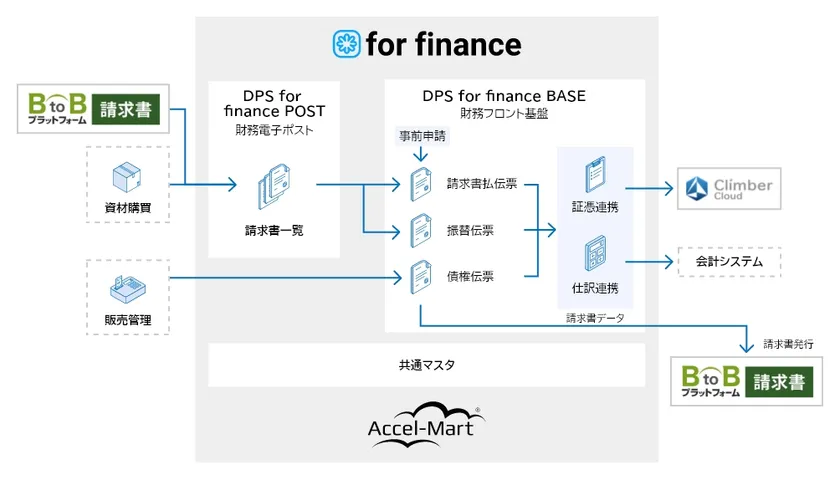 ※1:intra-mart DPS for financeは、経理部門の業務改善を支援する会計フロントのシステム基盤です。これまでシステム化されにくかった、月次チェック機能や一覧でのステータス確認機能をはじめ計上漏れ防止や決算早期化をサポートします。請求書電子化ソリューションと連携し、ペーパーレス化や支払依頼申請のデータ入力を最小化。テレワークでも、支払業務を滞りなく進めることができる、経理業務の改善基盤です。