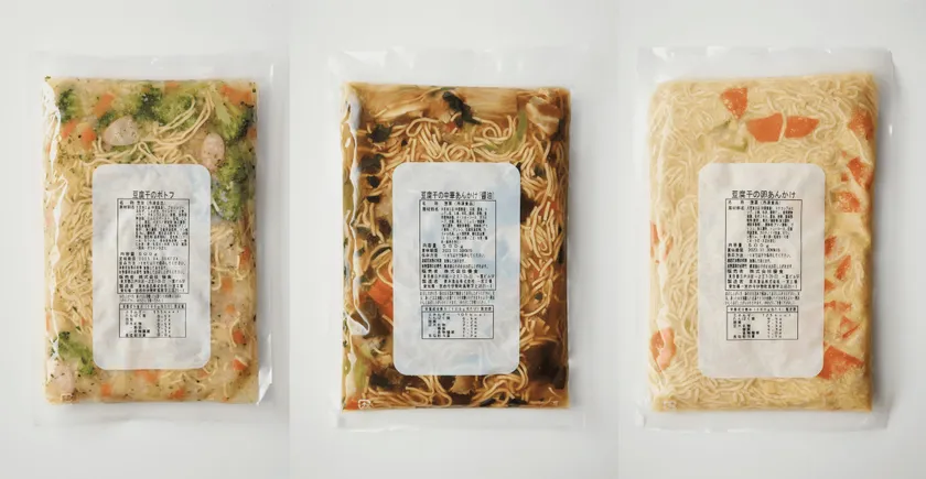 業務用 豆腐干 冷凍総菜 3種(左:「豆腐干のポトフ」 中央:「豆腐干の中華あんかけ」 右:「豆腐干の卵あんかけ」)