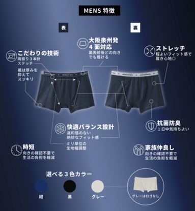 家族みんなを幸せにする、裏表のないスマート肌着「HONESTIES(オネスティーズ)」を2019年7月にリリースし、続いて2019年12月、世界初の「裏表がない」+「前後もない」スマート肌着「HONESTIES ∞(オネスティーズ アンリミテッド)」をリリースしTVでも話題となり国際的なユニバーサルデザインの賞も受賞のHONESTIES株式会社(代表取締役社長 西出喜代彦)が、今度は裏表前後のないスマートに生きる男性・お子さまのためのボクサーパンツをmakuakeで先行販売を開始しました!初日で目標の300%の達成をしています。