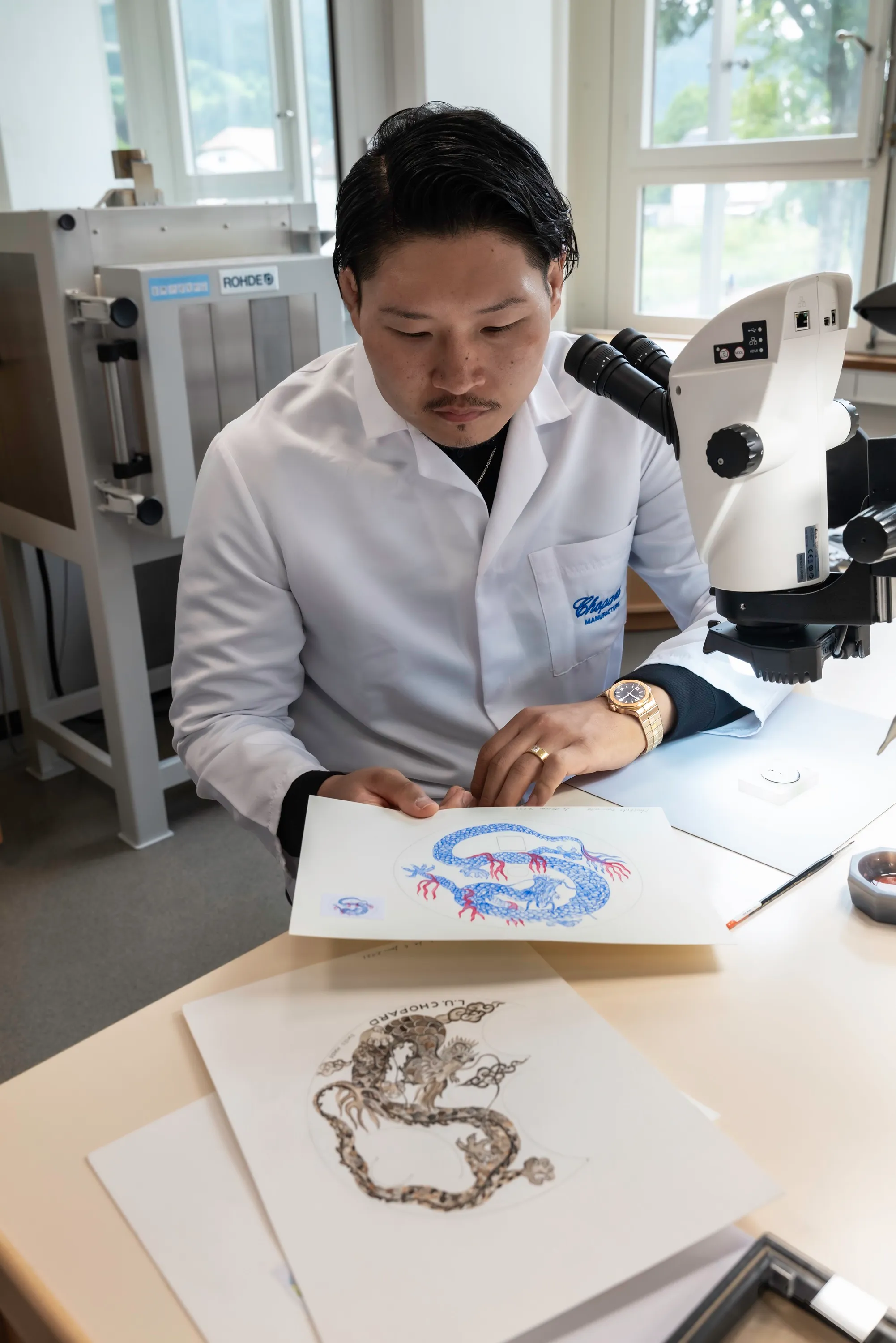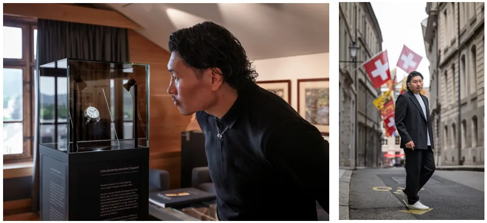 ジュネーブにある本社では、オーナーとともにアーカイブ作品や歴史資料、そしてファクトリーを見学した稲垣さん。フルリエのショパール マニュファクチュールでは、アルチザンたちの作業に興味津々な様子でした。白衣を着てほほ笑む貴重な姿も。ジュネーブ市内のブティック訪問では、ジャケットスタイルで時計を試着し、クールな表情を見せました。
