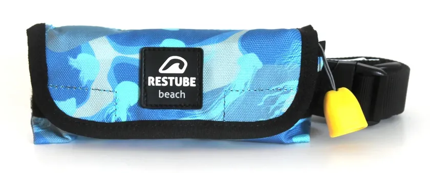 『レスチューブ・ビーチ KIDS』は、超小型・軽量の膨張式・緊急浮力体です。着用時は小型のポシェットで、重量はわずか190gです。もしもの時にトリガーコードを引くことで、瞬時にイエローの鮮やかな浮力体(ブイ)が目の前に現れます。抱きかかえ浮いていることができます。ブイの視認性が高いため、SOS発信装置として、外部に危機を伝え、浮いて救助を待つことができます。レスチューブ・ビーチ KIDSは10歳以上の泳げるお子様向けです。10歳未満のお子様には、必ずレスチューブを着用した大人が付いていてください。