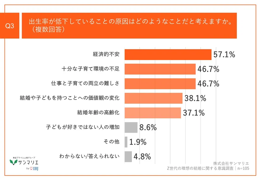 「Q3.出生率が低下していることの原因はどのようなことだと考えますか。(複数回答)」(n=105)と質問したところ、「経済的不安」が57.1%、「十分な子育て環境の不足」が46.7%、「仕事と子育ての両立の難しさ」が46.7%という回答となりました。