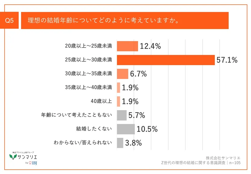 「Q5.理想の結婚年齢についてどのように考えていますか。」(n=105)と質問したところ、「25歳以上~30歳未満」が57.1%、「20歳以上~25歳未満」が12.4%、「結婚したくない」が10.5%という回答となりました。