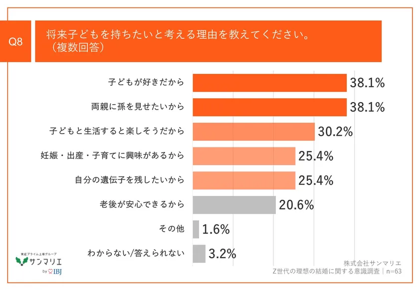 Q7で「はい」と回答した方に、「Q8.将来子どもを持ちたいと考える理由を教えてください。(複数回答)」(n=63)と質問したところ、「子どもが好きだから」が38.1%、「両親に孫を見せたいから」が38.1%、「子どもと生活すると楽しそうだから」が30.2%という回答となりました。