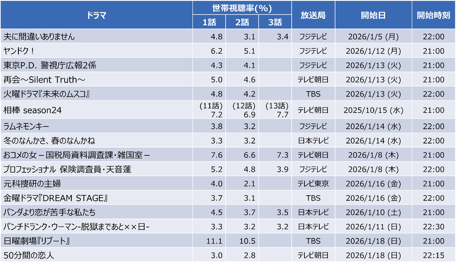 まずは、2026年冬ドラマの初回から第3話までの世帯視聴率を放送回ごとに見ていきましょう。16作品の各話視聴率を以下の表にまとめました。