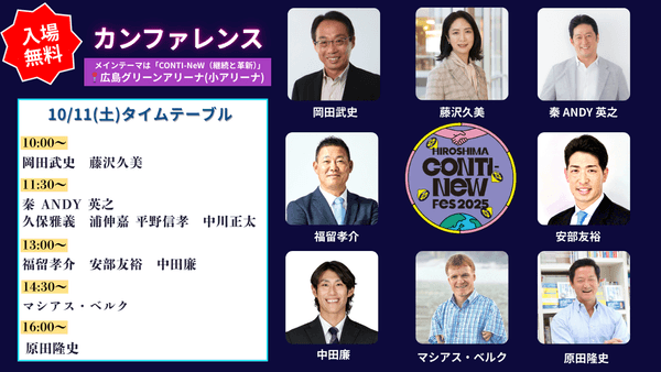 本イベントのコンセプトであるCONTINUE(継承)とNEW(革新)をメインテーマに各界の第一人者によるカンファレンスを10/11(土)・12日(日)の両日、広島グリーンアリーナ小アリーナで開催します。カンファレンスの登壇者第3弾として、秦英之氏・久保雅義氏・浦伸嘉氏・平野信孝氏・福留孝介氏・安部友裕氏・中田廉氏・中川悠介氏・石原健氏が決定。