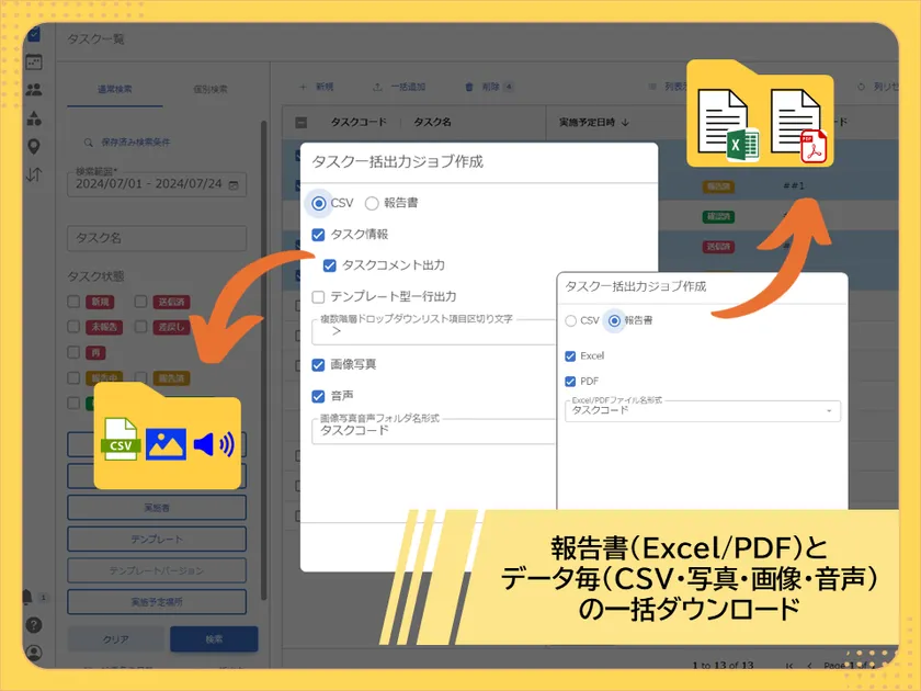 複数条件での業務一括指示や、報告データを様々なファイル形式で一括ダウンロードが可能
