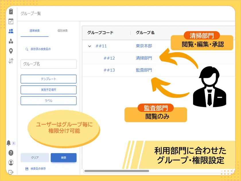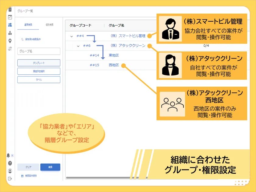 任意のグループを階層構造で設定・管理が可能。またグループ毎に細部にわたるユーザー権限の設定が可能