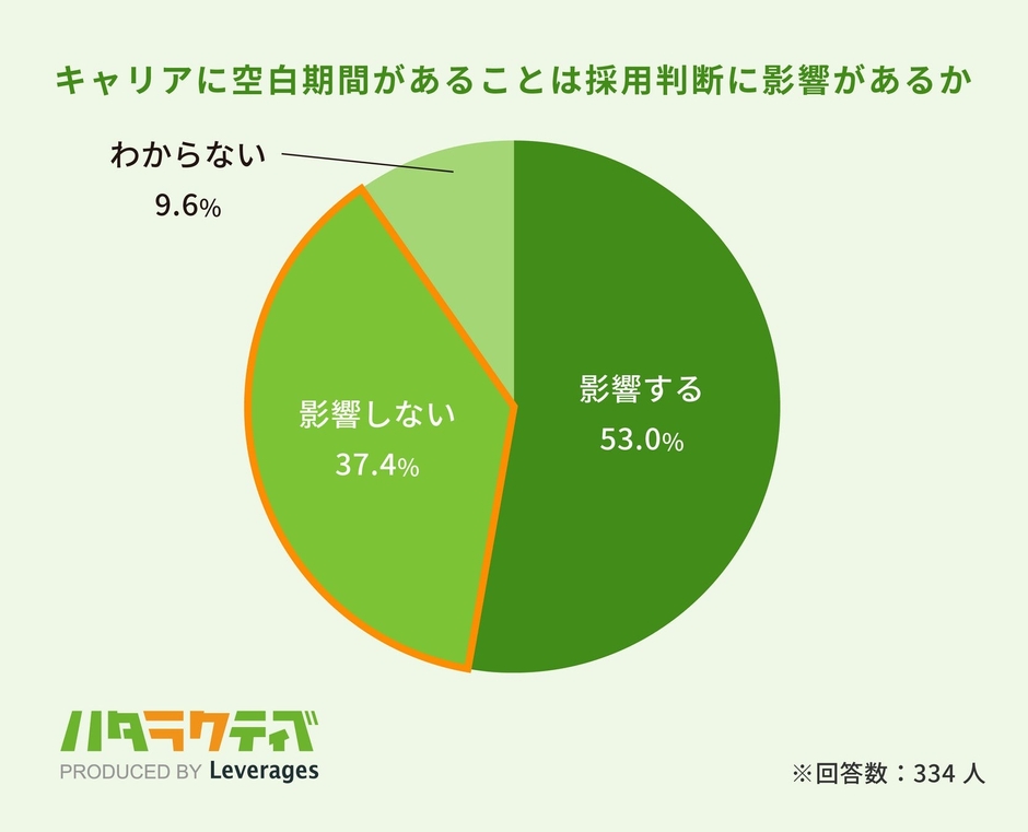 一方で約4割の企業がキャリアの空白期間は採用判断に影響しないと回答し、空白期間の有無や長さよりも、離職期間中の過ごし方や、空白期間を取得した背景に重きを置いて採用判断を行う企業も一定数存在します。