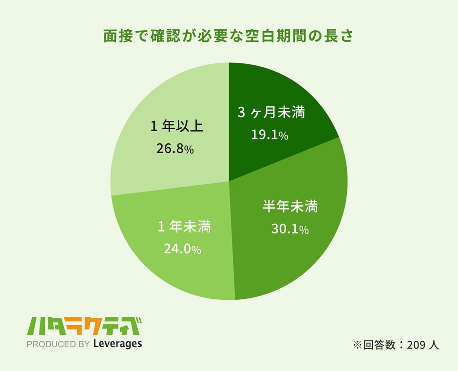 「どのくらいの空白期間があれば、面接で確認するか」を尋ねると、「半年未満(30.1%)」が最多となり、ついで「1年以上(26.8%)」「1年未満(23.9%)」と続きました。3ヶ月未満は2割以下となり、「候補者のキャリアに空白期間があることは採用判断に影響する」と回答した企業でも、3か月未満程度の空白期間では、採用に大きな影響を及ぼさないと考える企業が多いようです。
