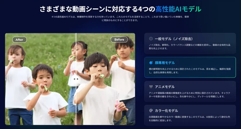 一般モデルは動画全体の画質を向上させることに特化しており、顔モデルは人物の顔のディテールをより鮮明に再現するために設計されています。この最適化により、全体的な画質が向上し、特に顔の表現がより自然でリアルになりました。