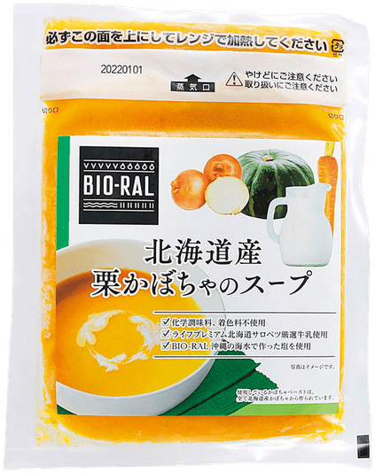 北海道産の栗かぼちゃペーストを使用。「ライフプレミアム北海道サロベツ豊富町厳選牛乳」と国産のにんじん・たまねぎ、クリーミーさを出すために口どけの良い北海道産リュクスチーズを加えました。やさしい甘みのかぼちゃとコクのある厳選牛乳を合わせ、旨みや甘みを感じられる「BIO-RAL沖縄の海水で作った塩」でほんのり塩気をプラスし素材の味を引き出しました。