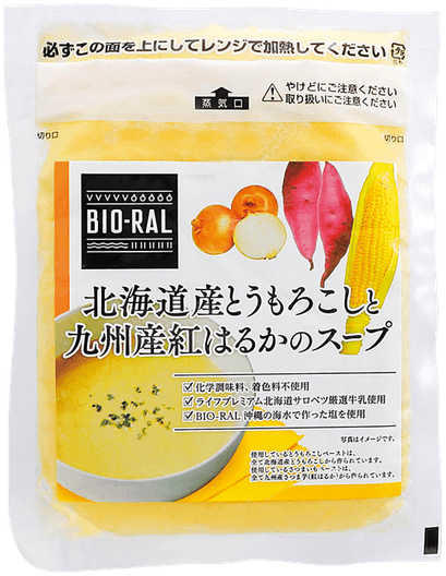 北海道産とうもろこしと鹿児島県産紅はるかを使用。「ライフプレミアム北海道サロベツ豊富町厳選牛乳」と国産たまねぎのソテーを加え、「BIO-RAL沖縄の海水で作った塩」で味を調えました。