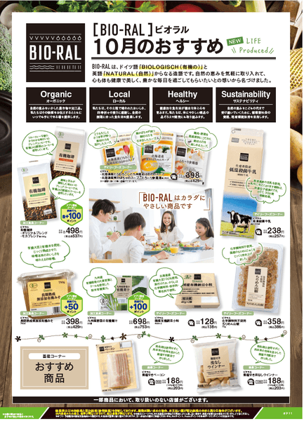 “BIO-RAL”とは、体に優しい素材や製法、健康や自然志向にあわせたプライベートブランド。「オーガニック」「ローカル」「ヘルシー」をコンセプトにこだわりの商品を取りそろえています。
