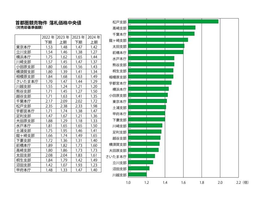 入札本数は顕著に減少しています。2022年には1都3県および茨城県南部では、落札となった物件の入札本数平均はほぼ10本を超えていましたが、今回は概ね首都圏全域で入札本数が減りました。その中で東京地裁本庁は減少幅が小さかったため、今回は東京地裁本庁が平均10.3本と、千葉地裁松戸支部の13.9本に次いで入札本数が多く、コロナ禍で入札本数が増えていた東京周辺部の横浜地裁相模原支部(相模原市、座間市)、さいたま地裁本庁、同越谷支部(越谷市、草加市、春日部市ほか)などで入札本数が大きく減少し、入札数の少なかったさいたま地裁川越支部と同熊谷支部(熊谷市、深谷市、行田市ほか)では5.4本でした。