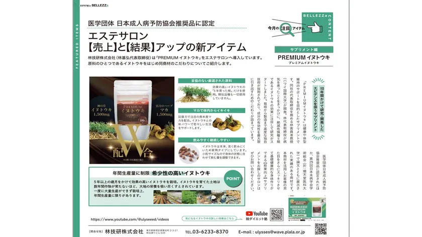 サプリメントの研究・開発、美容・健康サロン運営の林技研株式会社(所在地:東京都新宿区、代表:林 基弘)開発のサプリメント「PREMIUMイヌトウキ」がエステ業界誌『ESTETICa BELLEZZa』No.246(8月15日発行号)の<今月の注目アイテム>として取り上げられました。