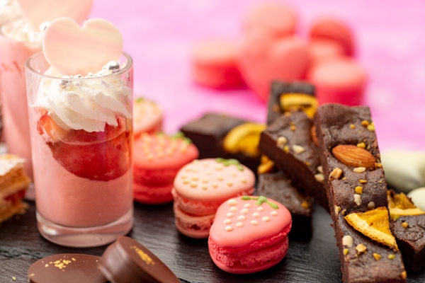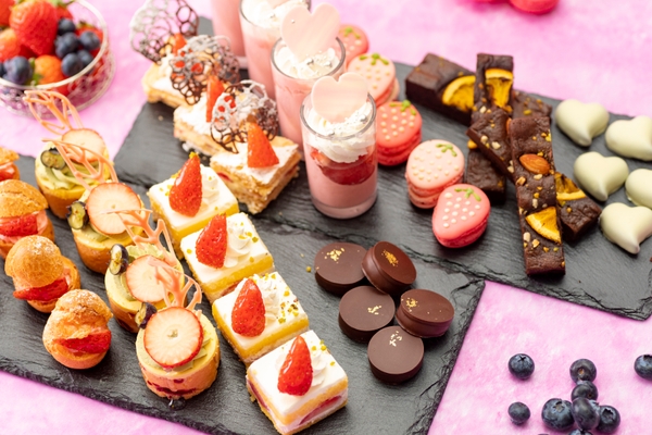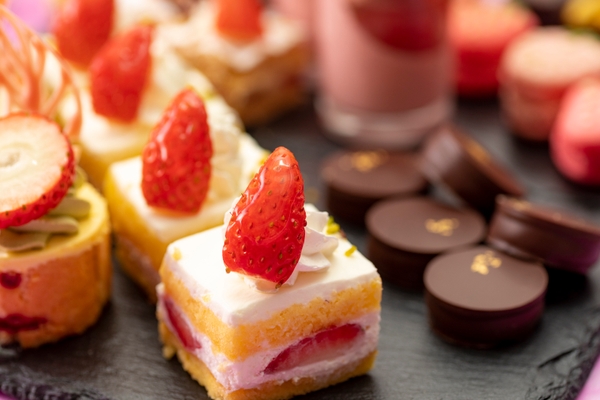 キュートなイチゴ型やハート型の『マカロン』、サクサクのパイ生地とイチゴの層が織りなす隠し味のホワイトチョコが決め手の『ミルフィーユ』。美らイチゴのジュレをサンドしたオリジナルフレジエ風ケーキの『ガトーフレーズ』。