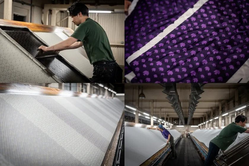 手捺染とは、型紙を使って布地に染料を刷り込んで染色する古くから引き継がれてきた伝統技法です。染料を注いで染める“注染染め”と比べて細かい模様や多色柄も染め上げることが出来ます。