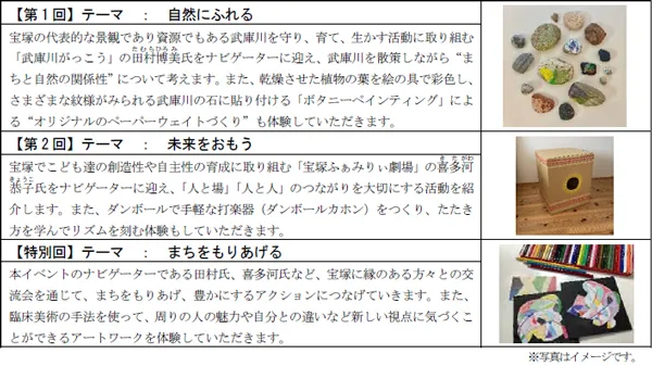 本イベントは、宝塚市(※1)の市民団体の方による活動の紹介とアート作品や打楽器をつくる体験を通じてまちの魅力や課題について考え、宝塚(※1)への愛着を深めていただくことを目的としています。第1回は「自然にふれる」をテーマに、武庫川とまちの共生に向けた活動を知り、武庫川の石を使ったペーパーウェイトづくりを体験していただきます。続く第2回は「未来をおもう」をテーマに、こども達の創造性や自主性を育む活動を知り、ダンボールを使った打楽器づくりを体験していただきます。また、特別回では「まちをもりあげる」をテーマに、市民団体の方々を交えて、まちを活気づけ、豊かにするアクションにつなげる交流会を実施するとともに、臨床美術の手法を使ったアートワークを行います。