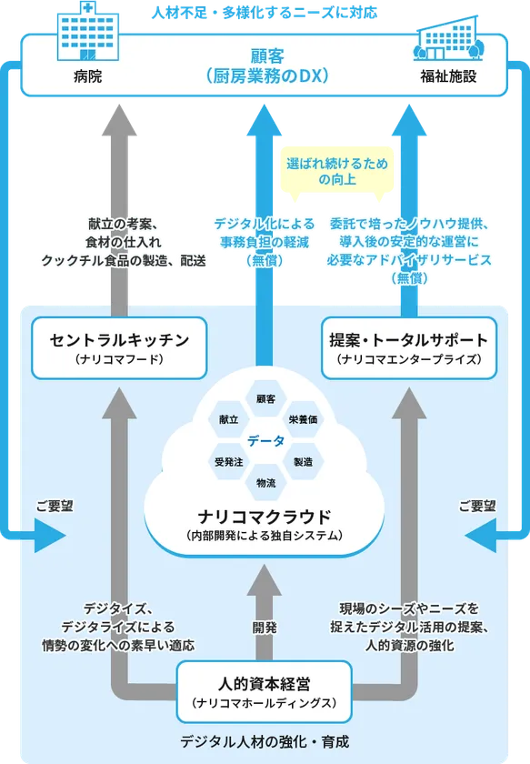 病院・介護施設のご利用者さまに安全でおいしいお食事を楽しみ続けていただくためには、働き手不足が進む中でもお食事が提供できる環境を作ることがナリコマの使命です。それらを実現するためにDXは選択肢ではなく「必須」と捉え、企業活動全体をデジタルを介して思考することを続けてきました。