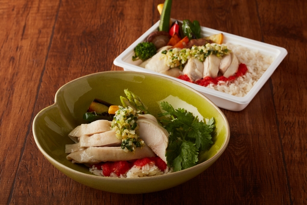 丸鶏にネギと生姜を詰めて、ゆっくり煮込み、一度乾燥し、うまみをしっかりと閉じ込めました。パンダンの葉で炊き上げた、香味野菜の薫りを出した油で炒めたライスは絶品です。ソースもひとつ一つ丁寧に手作りで仕上げました。すべての材料に統一した下味が。一緒に食べた瞬間に、口の中に広がるそのひと時を感じてください。