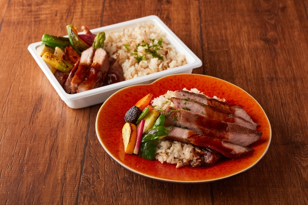 豚肩ロースに1%の塩をすり込み、しっかりと火を入れ、その後は一気に強火で香ばしくソテーしました。ソースには、日本古来から伝わる、豊かな香りと旨味を待つ「もろみ醤油」をベースに、はちみつと、ほんのりトリュフの香りを忍ばせました。和出汁にバターでコクと香りをつけた炊き込みご飯は、噛み締めるほどに味わい深く、それだけでもお楽しみいただけます。