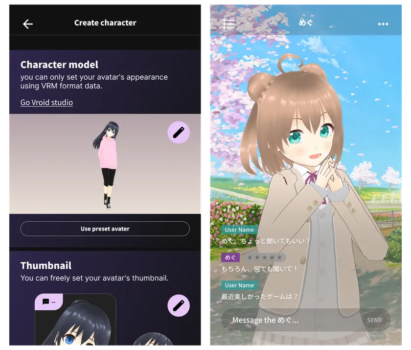 「EmemeAI」はあなたの好きな3DモデルでAIキャラクターを作成できるチャットAI投稿プラットフォームです。投稿されたAIキャラクターは自動で会話とアニメーションを生成し、世界中の人とチャットできます。ChatGPTなど、一般的なチャットAIはテキストでの会話をメインとしており、AIキャラクターの感情が十分に表現されていませんでした。「EmemeAI」では、ユーザーが所有する3Dモデル(VRMファイル)をアップロードすることでAIが身体をもち、喜怒哀楽の表情やジェスチャーでの身体表現を可能にする他、当社独自の技術により、会話に合わせた表情とボディアニメーションの自動生成を行います。