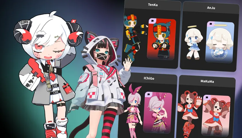 AIキャラクターの3Dモデルは自分でアップロードする他に、初期アバターから選ぶこともできます。株式会社壽屋(以下「コトブキヤ」)より、さいとうなおき氏、寺田てら氏をはじめとする人気イラストレーターにデザインされた個性豊かな7体のアバターを選択可能です。