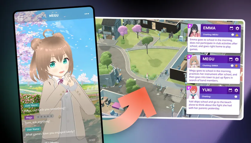 「EmemeAI」で作成したAIキャラクターは、自社開発中のAI-NPC箱庭ゲーム「EmemeTown」に接続することで、ゲームの世界でリアルタイムに生活するNPCとして、AIキャラの行動をシミュレーションできるようになる予定です。また、年内のアップデートで、複数のAIキャラクターによるグループチャット機能を追加します。今後はAIと人間の1on1チャットの他に、AIキャラクター同士のかけあいや、仲良く生活する様子を観察する楽しみも増やしていくつもりです。