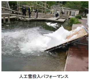 水上アスレチックエリアに1日約25tの人工雪を投入するパフォーマンスを実施し、夏の暑さを吹き飛ばします。