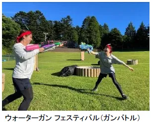 (2)ガンスプラッシュ:仲間同士で水鉄砲を使って水遊びを楽しむ爽快なふれあい体験。