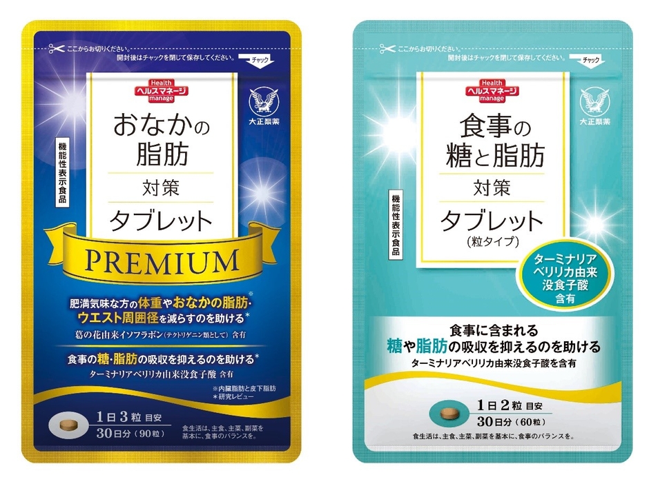 大正製薬株式会社[本社:東京都豊島区 社長:上原 茂](以下、当社)は、健康食品「ヘルスマネージ」シリーズから、機能性表示食品の「おなかの脂肪対策タブレットPREMIUM(粒タイプ)」と「食事の糖と脂肪対策タブレット(粒タイプ)」の2品を7月29日(月)より、当社通販サイト『大正製薬ダイレクト』にて発売いたします。