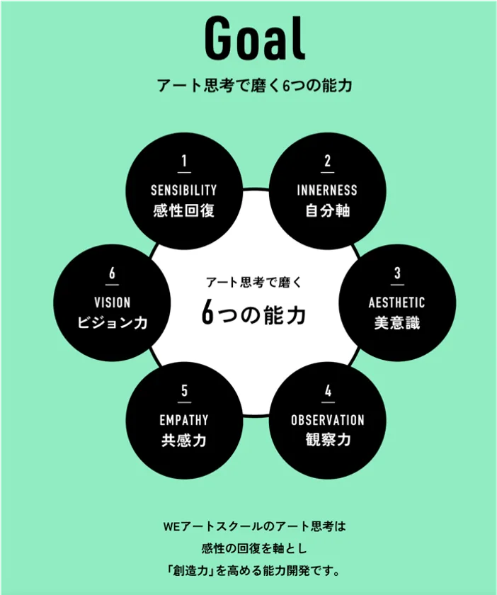 「アート思考」は、アーティストが持つ創造性や発想力を身につけてビジネスに活かす、今、世界的に注目を集める最先端の学びです。WEアートスクールでは、感性の回復を軸とし、特にビジネスでの活用に期待が高まっている「6つの能力」を高めるためのプログラムを設計・提供してまいります。