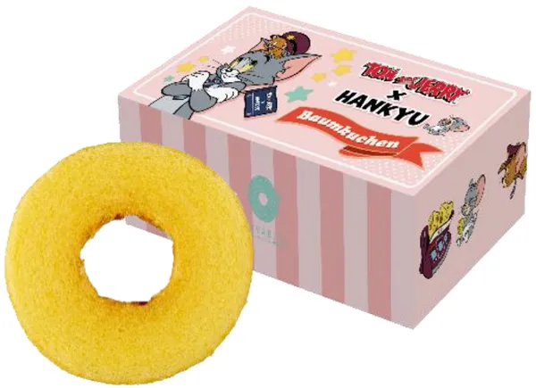 トムの好物“ミルク”風味のバウムクーヘンとジェリーの好物“チーズ”風味のバウムクーヘン、阪急電車のマルーンカラーをイメージした“いちじく”風味のバウムクーヘンの3つをセットにしてコラボオリジナルボックスにて販売します。