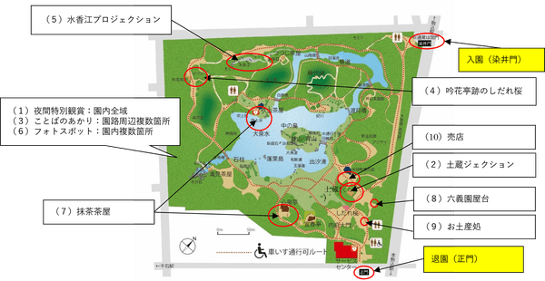 ※17時に一度閉園し、18時30分から夜間特別観賞のため再開園します。混雑状況によりご入園時に待ち時間が発生する場合がございますので何卒ご了承ください。入園は染井門、退園は正門となります。また、夜間は安全確保のため立ち入りを制限する区域があります。