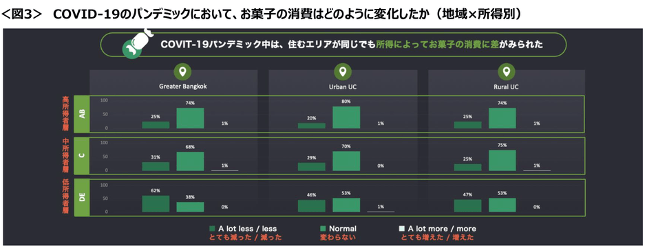お菓子において、地域軸及び所得軸で分析したところ、バンコク首都圏在住の高所得者層では消費が「変わらない」と回答した人が7割を超えるのに対し、低所得者層では消費が「減った」と答えた人が6割を超えている。住むエリアが同じでも、所得によって消費の変化は異なることが窺える結果となった。<図3>