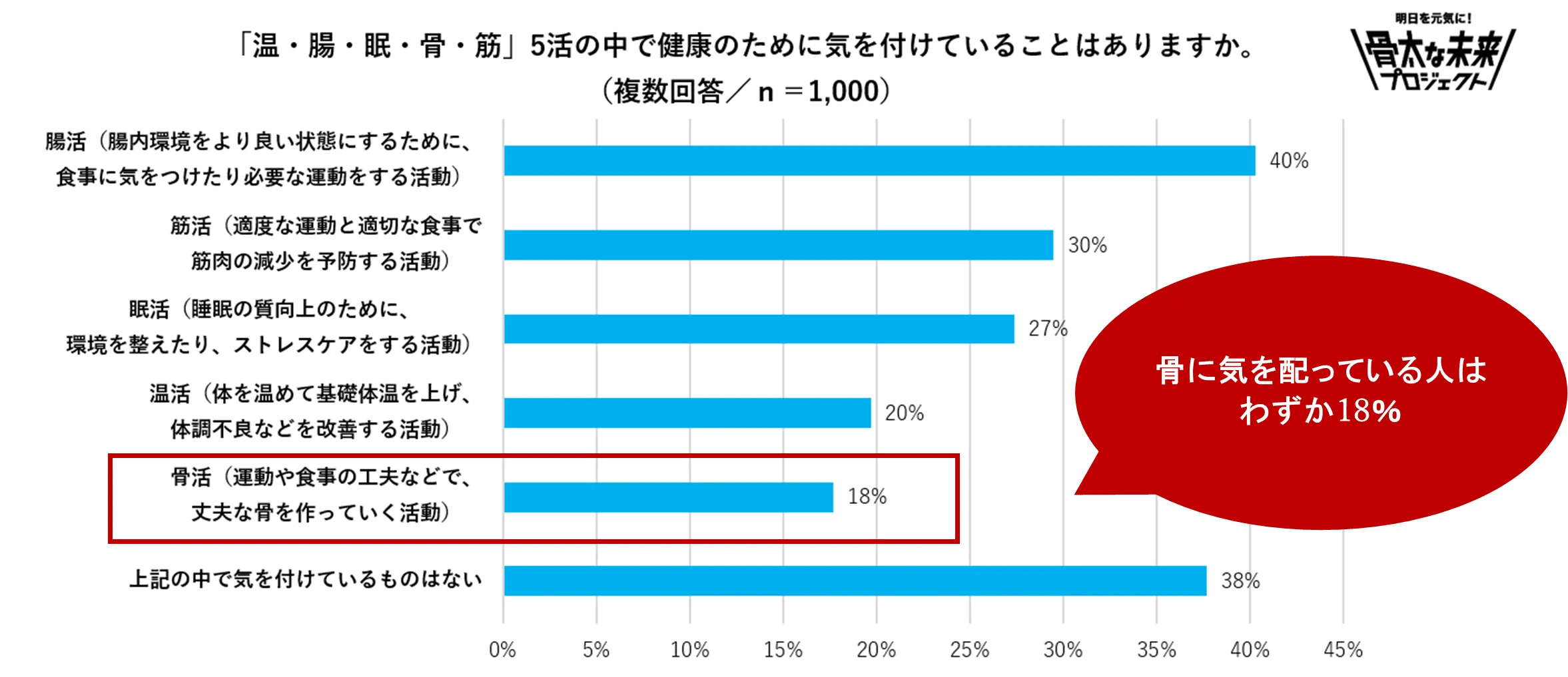 「温・腸・眠・骨・筋」5活の中で健康のために気を付けていることはありますか。」という問いに対して、「腸活」(40%)、「筋活」(30%)、「眠活」(27%)、「温活」(20%)、「骨活」(18%)の結果となり、「骨の健康」のために、ケアやメンテナンスしている人が少ないことがわかりました。