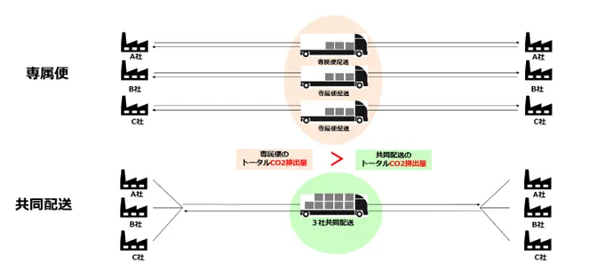 メタル便は、2000年より「共同配送」を提供しています。「共同配送」は従来の「専属便」より効率的でCO2排出量も少ないとみられていますが、定量的な評価はされていません。そこで3社は、本実証においてメタル便が提供している「共同配送」のCO2排出量の可視化をはじめとする以下の取り組みを行います。