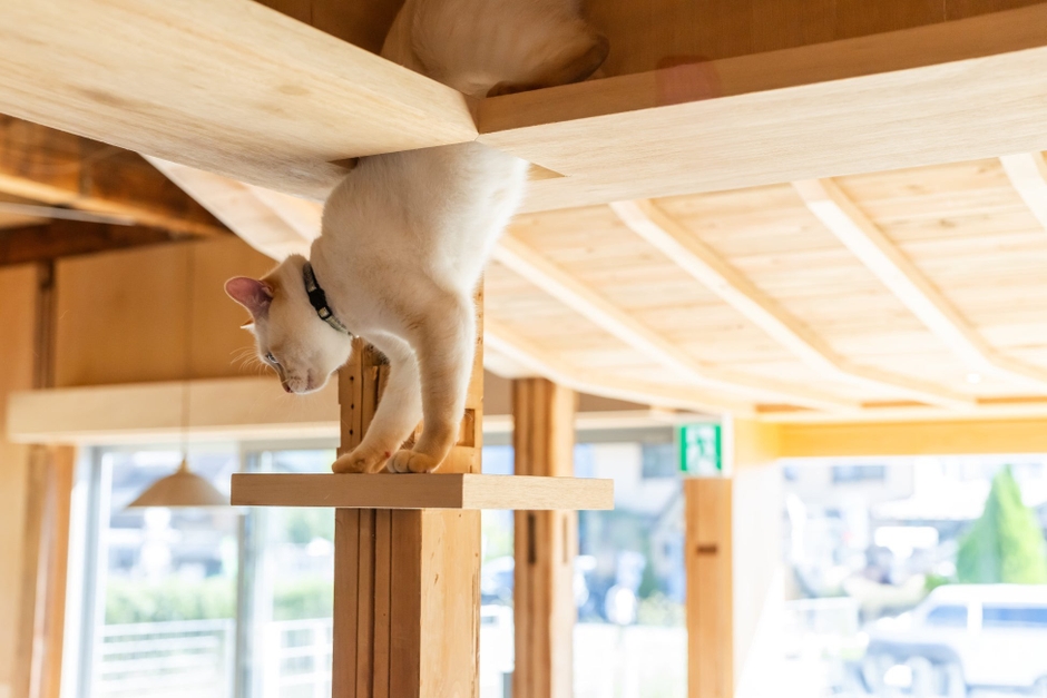 館内には猫や小さな仲間たちのためのキャットウォークを設置。愛猫たちがのびのびと遊び、くつろげる居場所を確保しました。