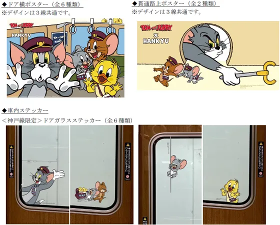 ラッピング列車「トムとジェリー号」には、車体に阪急沿線各地におでかけするトムとジェリーたちのデザインを施すほか、オリジナルヘッドマークを掲出し、マルーンカラーの制服を着たトムとジェリーたちのぬいぐるみが乗務員室に添乗します。車内にもポスターやステッカーを掲出し、「トムとジェリー」の世界観を演出しました。