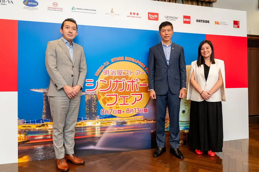 左から株式会社明治屋 代表取締役社長 磯野太市郎様、シンガポール大使館 オン・エン・チュアン大使様、シンガポール企業庁 食品製造・アグリテック部門 部門長 シャロン・テイ様