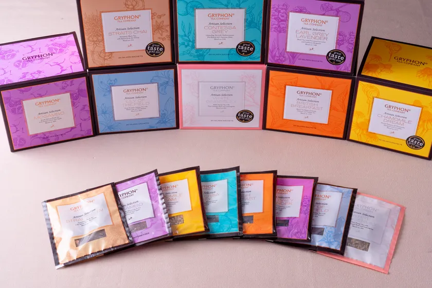 デザインがおしゃれなGryphon Tea。昨年は「ブリティシュ・ブレックファースト」や「モガンボ」が特に人気(ともに3,230円)。フェア後も5店で販売継続する予定。