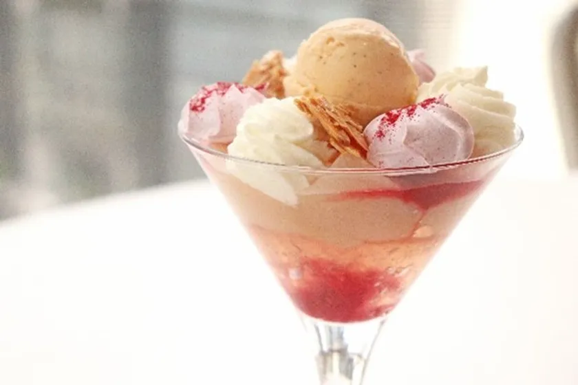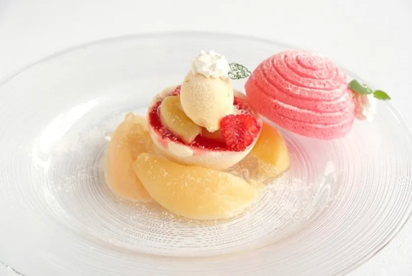 みずみずしい桃のコンポートに添えるのは、桃のムース、バニラアイスとフランボワーズソース。ピンクのメレンゲを被せて、お洒落なアシェットデセールに変身。桃の魅力を余すことなく楽しめる一皿です。