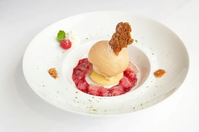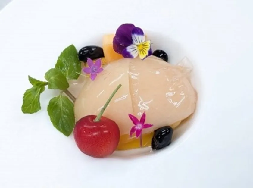 ベルベーヌコンポートの桃の中にフランボワーズジャム、黒ごまわらび餅、白桃ジャム、ヨーグルトのスフレグラッセを入れました。周りにはコンポートジュレ、紅玉蜜のジュレ、紅玉蜜と、紅茶のアイス、りんごのチャツネを添えて。白桃と紅玉蜜のソースをつけてお楽しみいただけます。