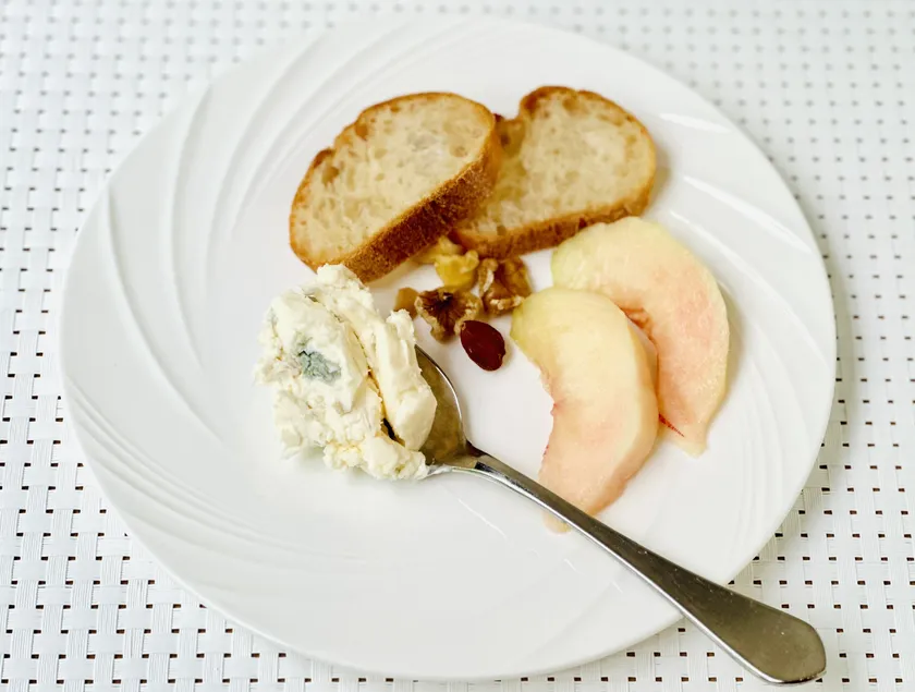 ミクニマルノウチ「マスカルポーネチーズとゴルゴンゾーラチーズのコンビネーション福島県産の桃のマリネ」