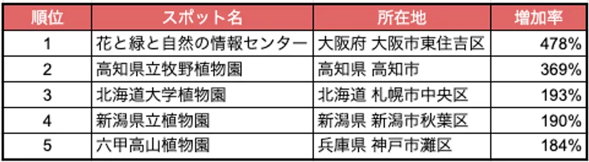 2022年7~8月と2023年7~8月の人流量を比較し、スポットをカテゴリ別にご紹介しました。1位は「動植物園・水族館」では花と緑と自然の情報センター(大阪府 大阪市東住吉区、前年比478%)、「史跡・城跡・城郭」は岡崎城(愛知県 岡崎市、前年比1107%)、「神社・寺院・教会」は静岡浅間神社(静岡県静岡市葵区、前年比554%)、「海水浴場」では北谷公園サンセットビーチ(沖縄県 中頭郡北谷町、前年比226%)でした。「動植物園・水族館」については、トップ5が全て植物園であり、当時放送されていたテレビドラマの影響が出ていることが推測されます。