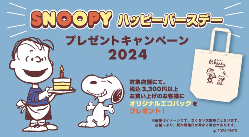 キャンペーンでは、2024年8月10日(土)から対象となる「ピーナッツ」公式ショップ各店で税込み3,300円以上のお買い上げのお客様にキャンペーンオリジナルデザインのエコバッグ(非売品)を1つプレゼントいたします。(各店舗での準備数に限りがあるため、無くなり次第終了となります。)